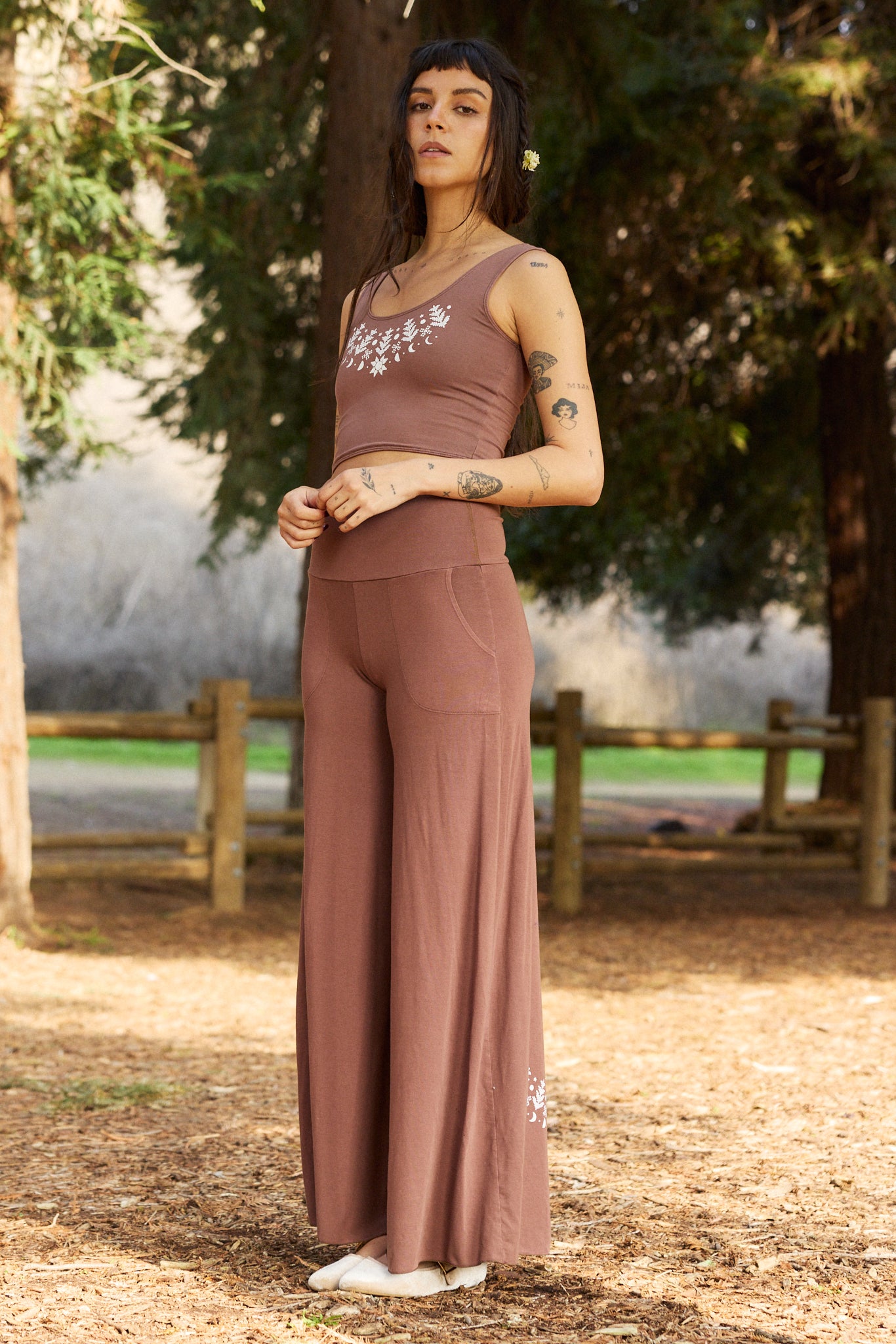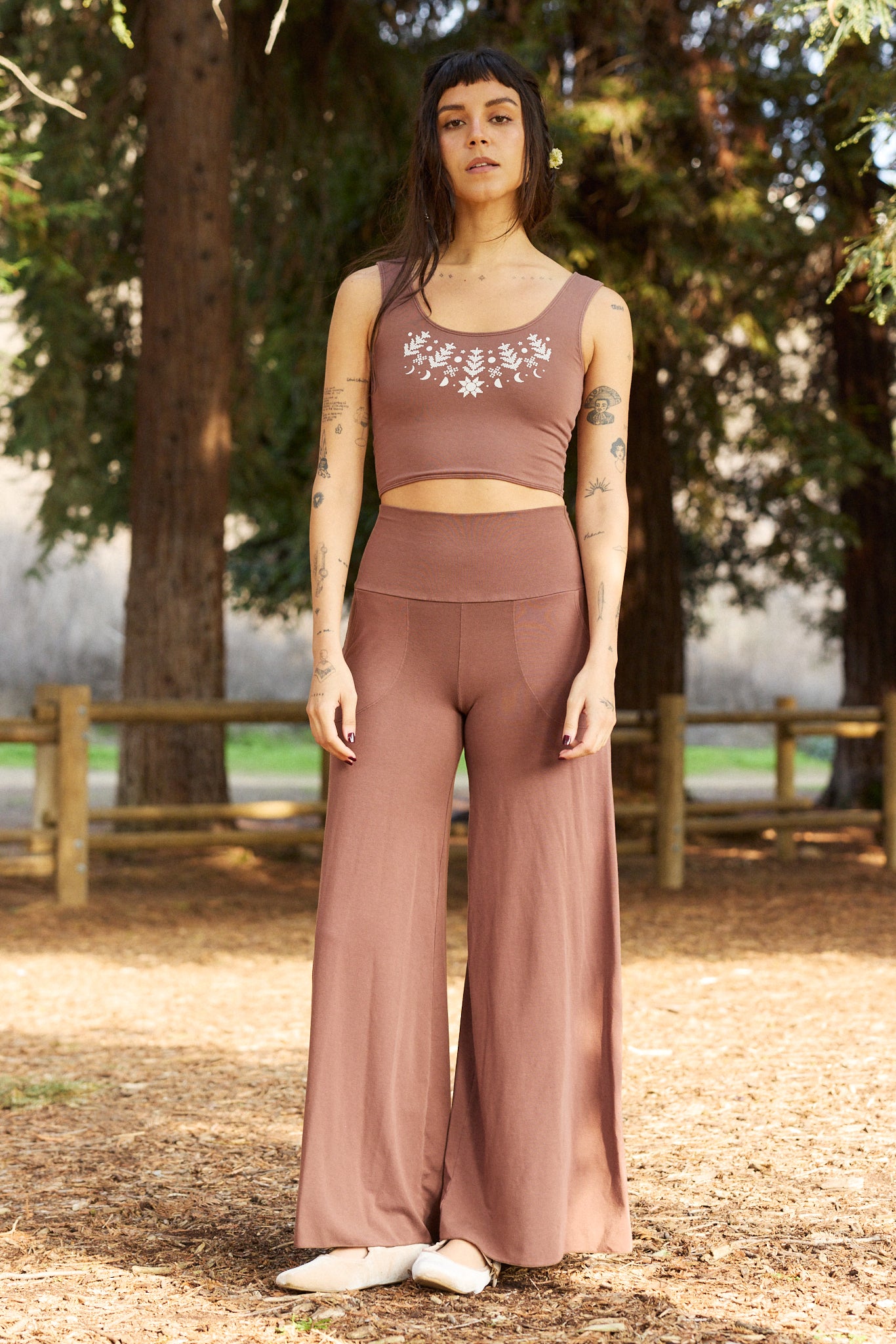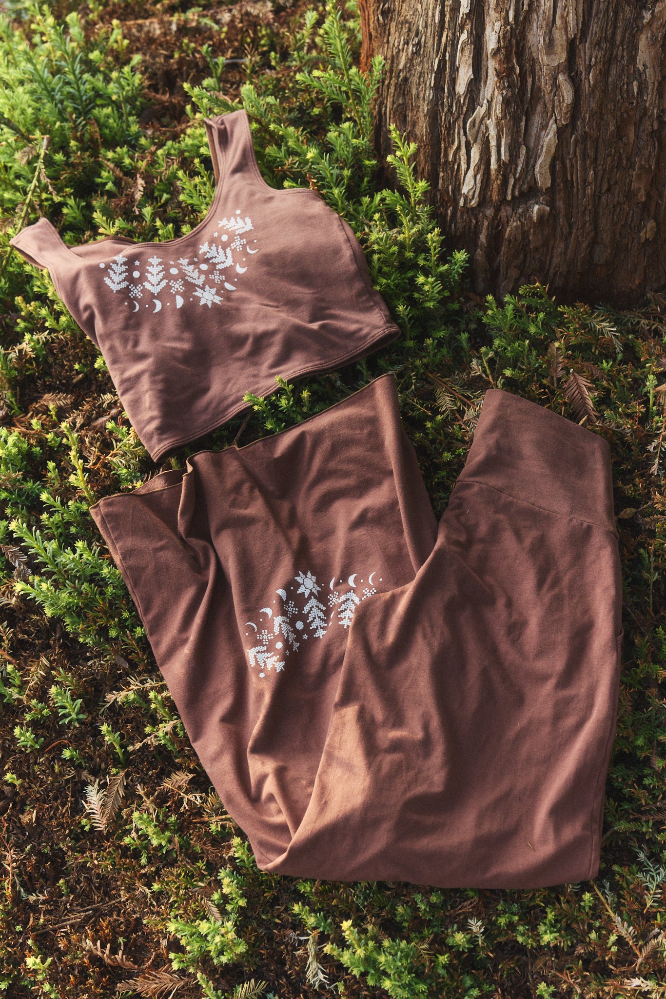We use plant-based fabrics like TENCEL™ lyocell, ECOVERO™ viscose, and organic cotton, blended with Creora® bio-based spandex for gentle stretch. While the spandex still contains some petroleum, it’s partially derived from renewable sources—making it a better option than traditional synthetics. The result: soft, breathable, lower-impact clothing that feels as good as it is.