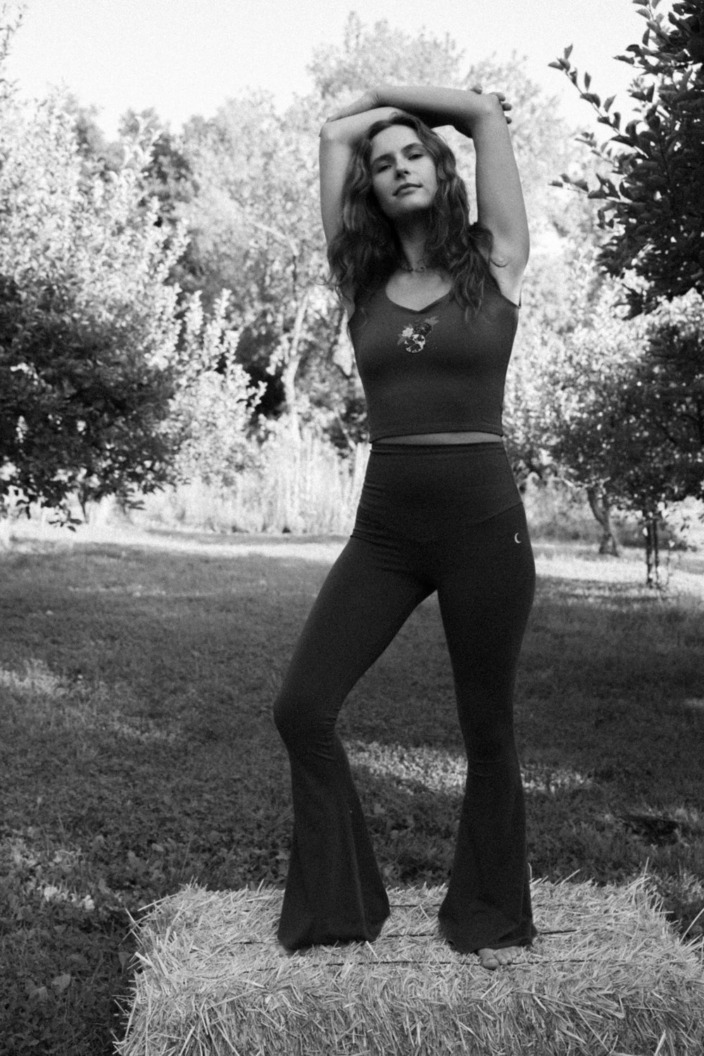 We knit our fabrics in Los Angeles, work with a GOTS-certified dye house, and print exclusively with water-based inks. Every design is created in collaboration with female artists, and all of our production partners are small, family-owned studios located within a 25-mile radius of downtown LA, bringing our vision to life with care and integrity.