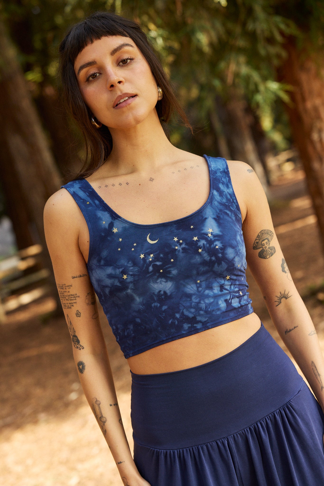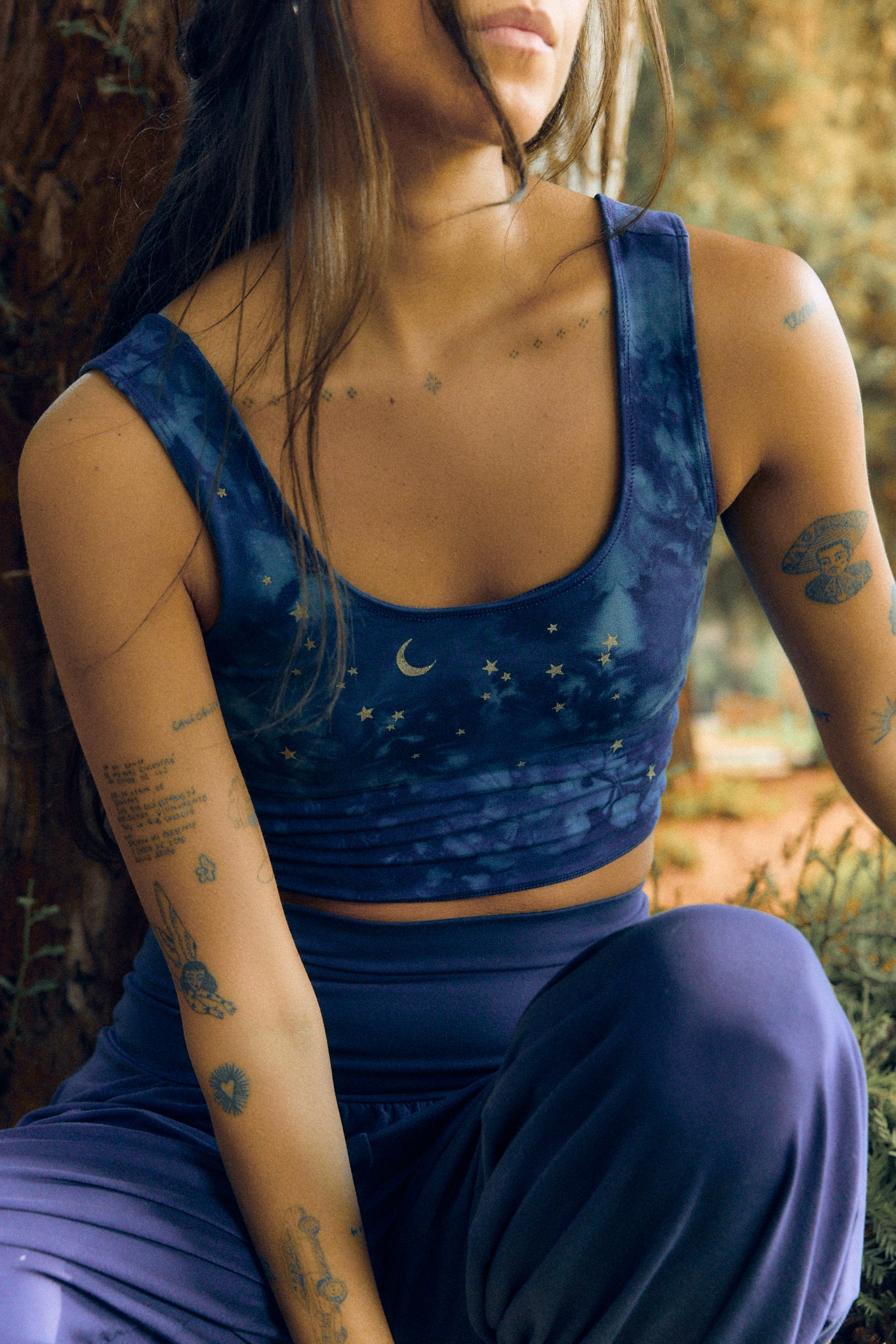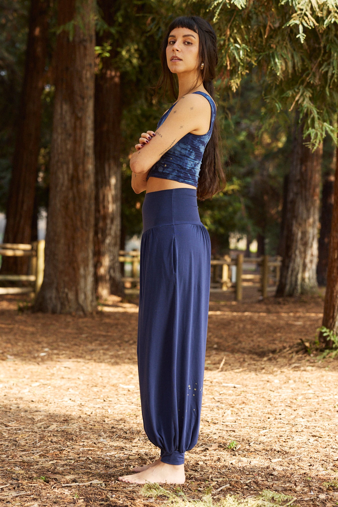 We use plant-based fabrics like TENCEL™ lyocell, ECOVERO™ viscose, and organic cotton, blended with Creora® bio-based spandex for gentle stretch. While the spandex still contains some petroleum, it’s partially derived from renewable sources—making it a better option than traditional synthetics. The result: soft, breathable, lower-impact clothing that feels as good as it is.