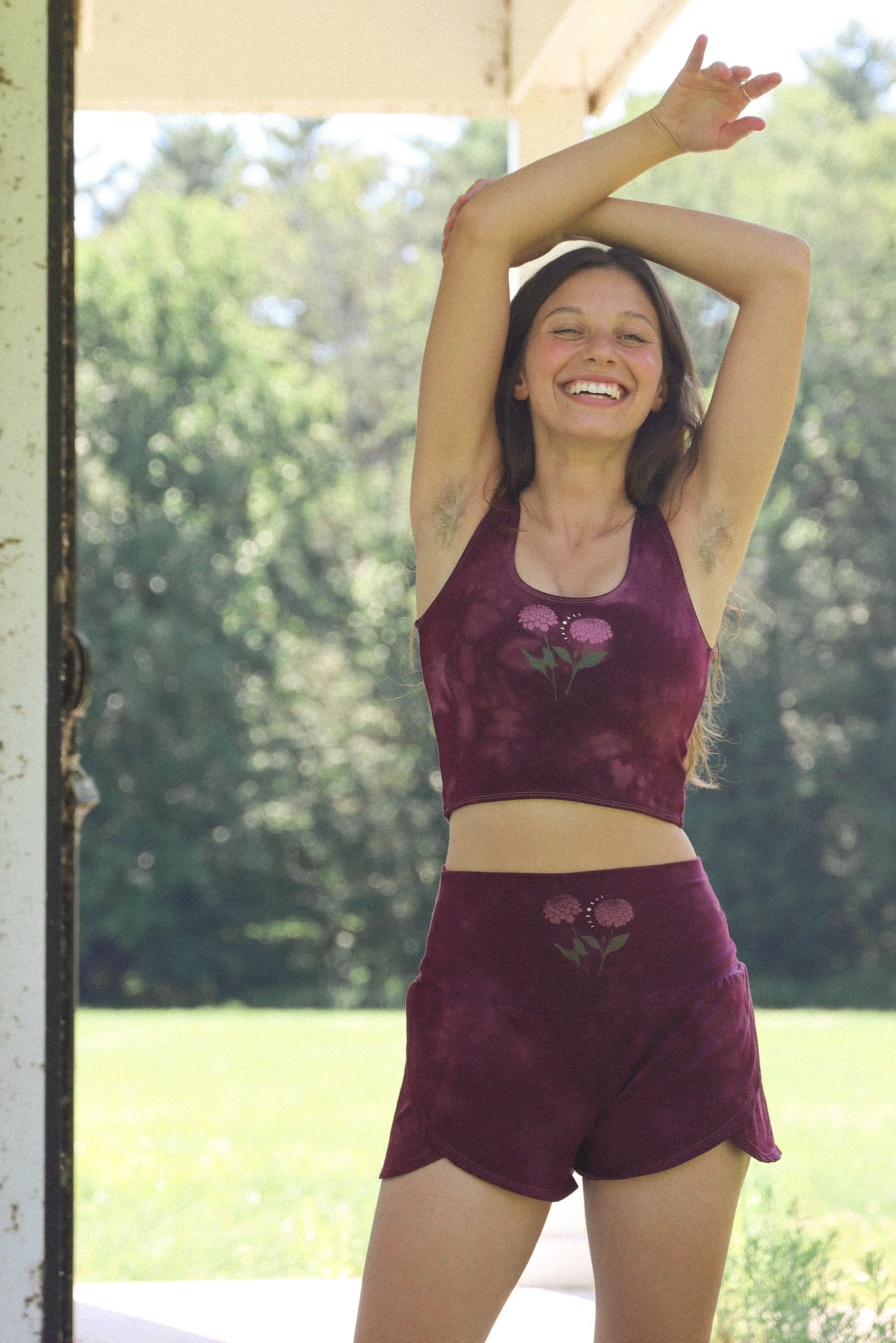 We use plant-based fabrics like TENCEL™ lyocell, ECOVERO™ viscose, and organic cotton, blended with Creora® bio-based spandex for gentle stretch. While the spandex still contains some petroleum, it’s partially derived from renewable sources—making it a better option than traditional synthetics. The result: soft, breathable, lower-impact clothing that feels as good as it is.