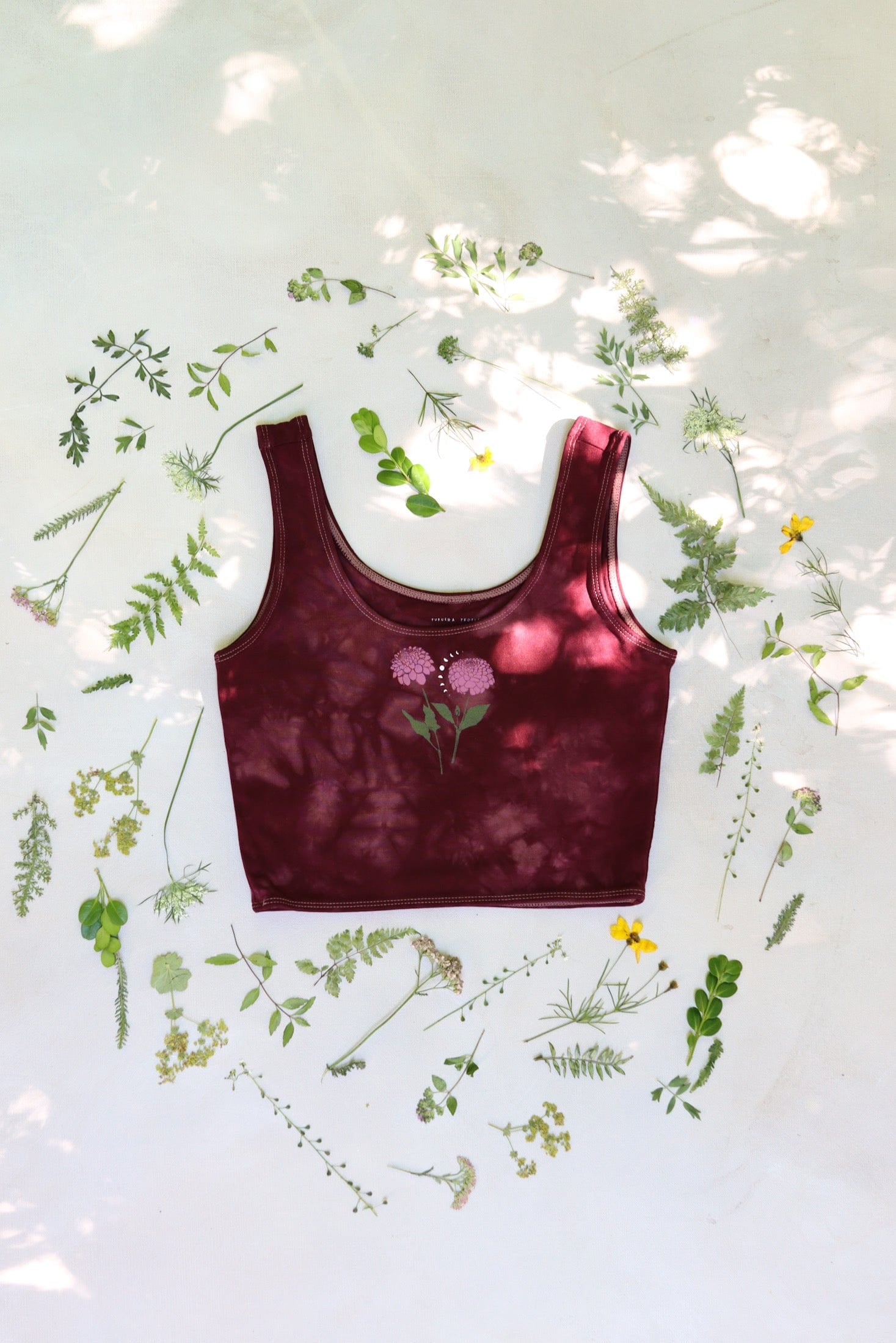 Dyed wild ginger and wine. Earthy pink dahlias and white moon phase printed with water based ink. Cut, sewn, dyed, and printed in downtown Los Angeles by small family owned shops where creators are paid more than minimum wage.