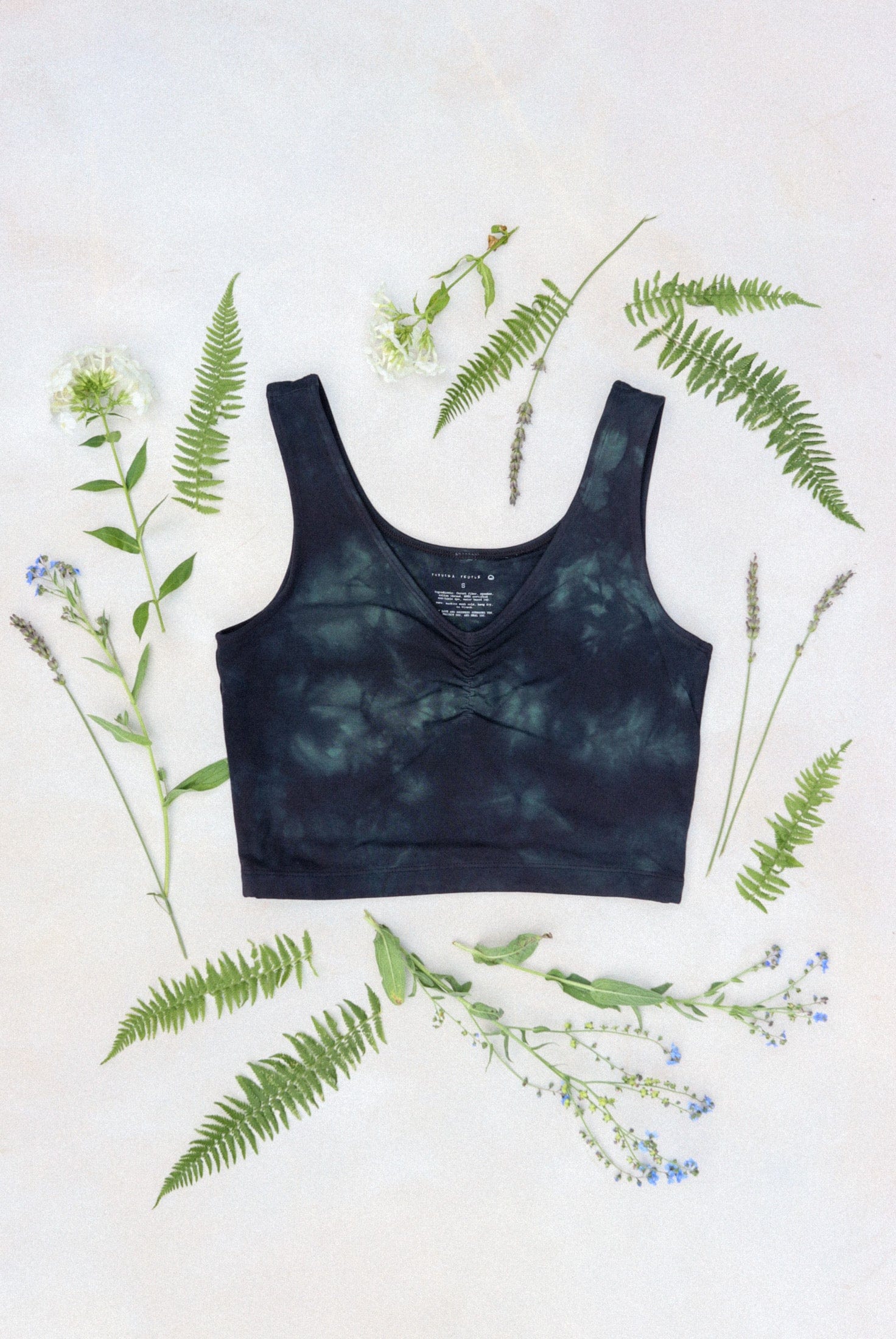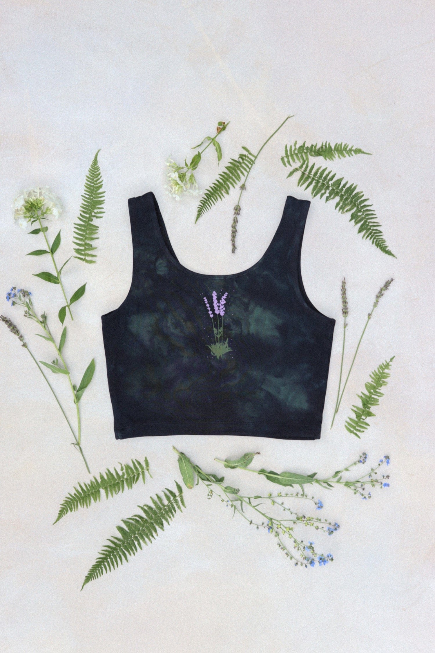Dyed sycamore green and meteorite deep purple on top. Lavender buds printed with water based ink on back. Cut, sewn, dyed, and printed in downtown Los Angeles by small family owned shops where creators are paid more than minimum wage.