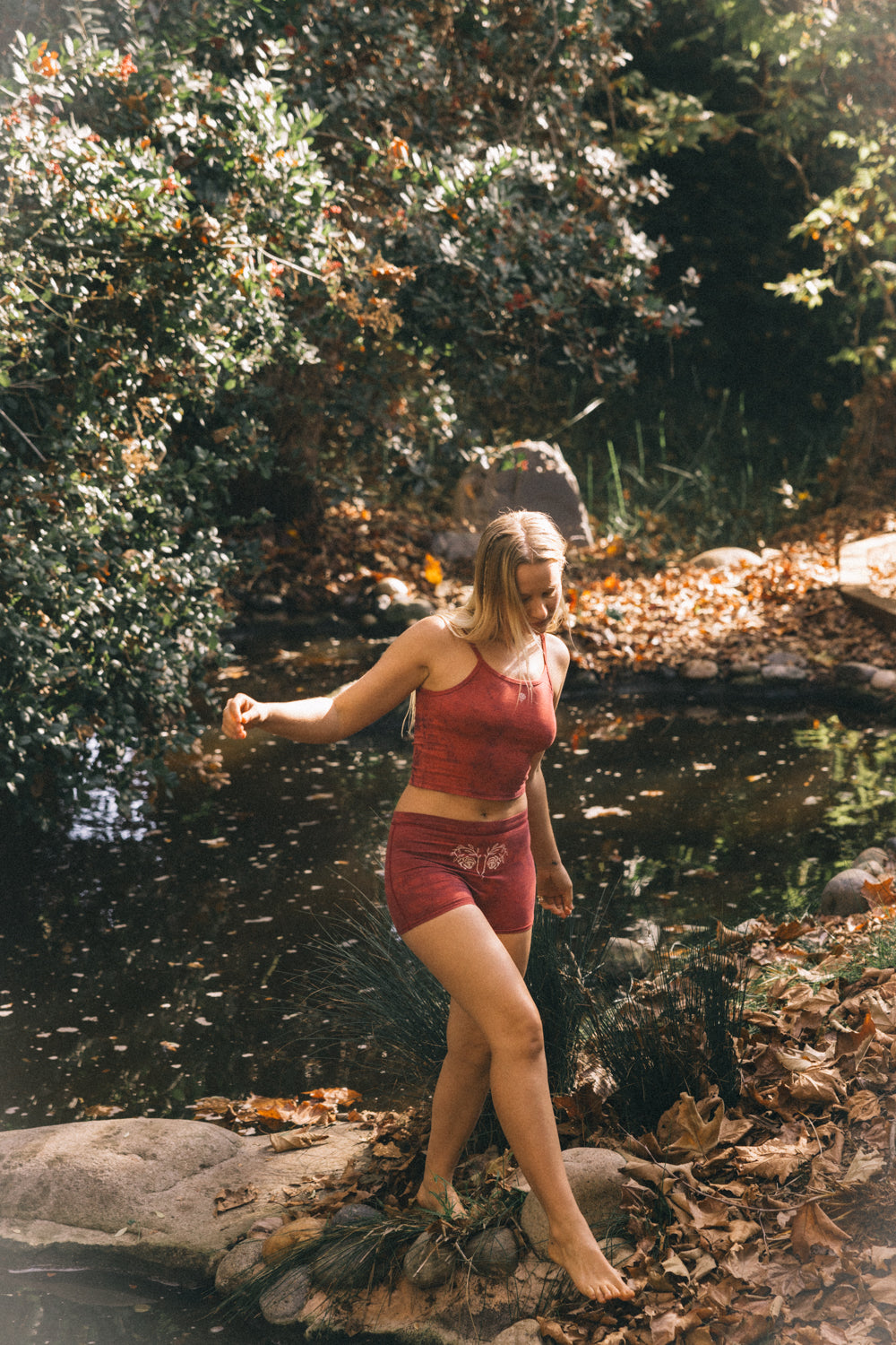 We knit our fabrics in Los Angeles, work with a GOTS-certified dye house, and print exclusively with water-based inks. Every design is created in collaboration with female artists, and all of our production partners are small, family-owned studios located within a 25-mile radius of downtown LA, bringing our vision to life with care and integrity.