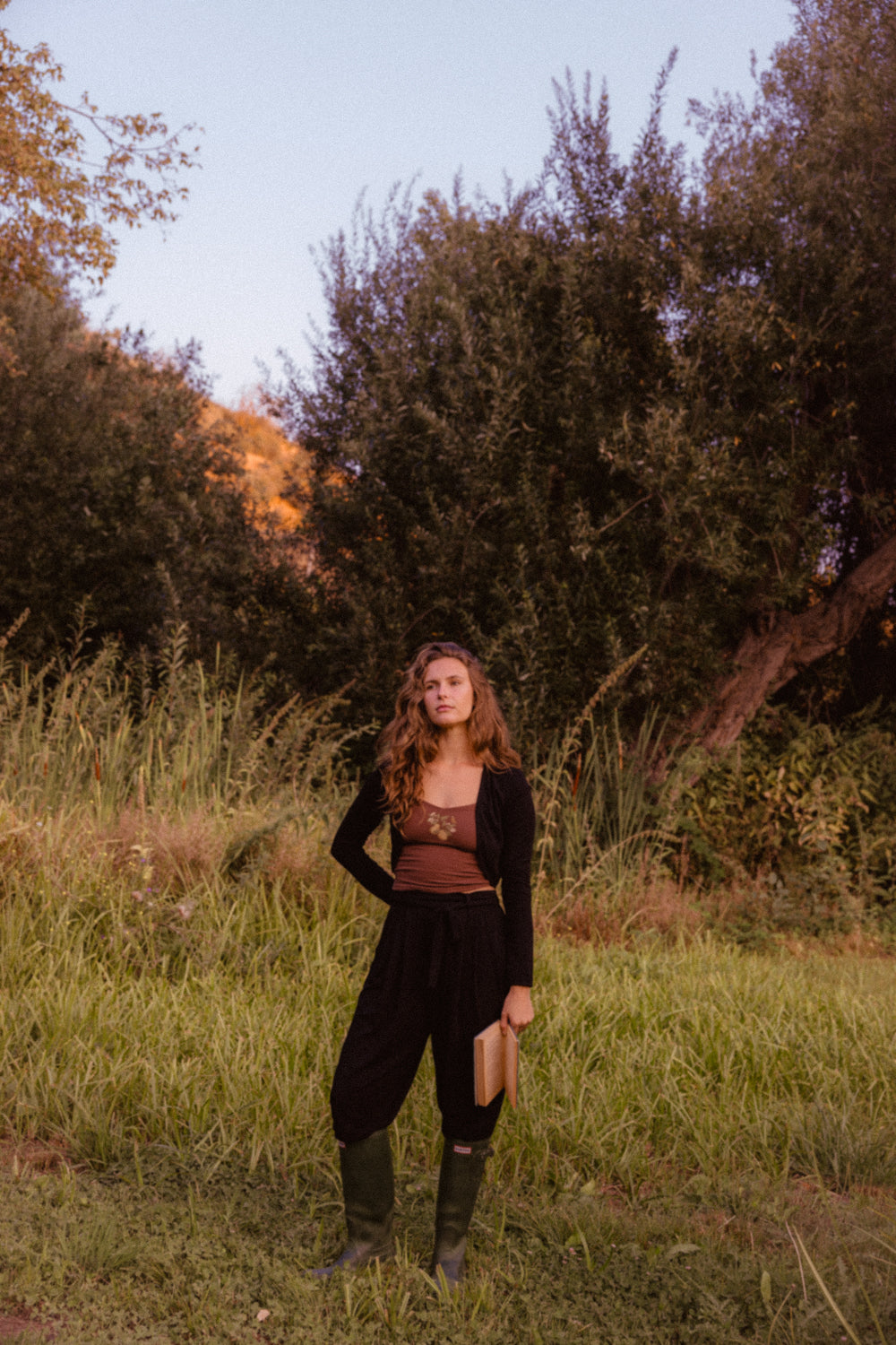 We knit our fabrics in Los Angeles, work with a GOTS-certified dye house, and print exclusively with water-based inks. Every design is created in collaboration with female artists, and all of our production partners are small, family-owned studios located within a 25-mile radius of downtown LA, bringing our vision to life with care and integrity.
