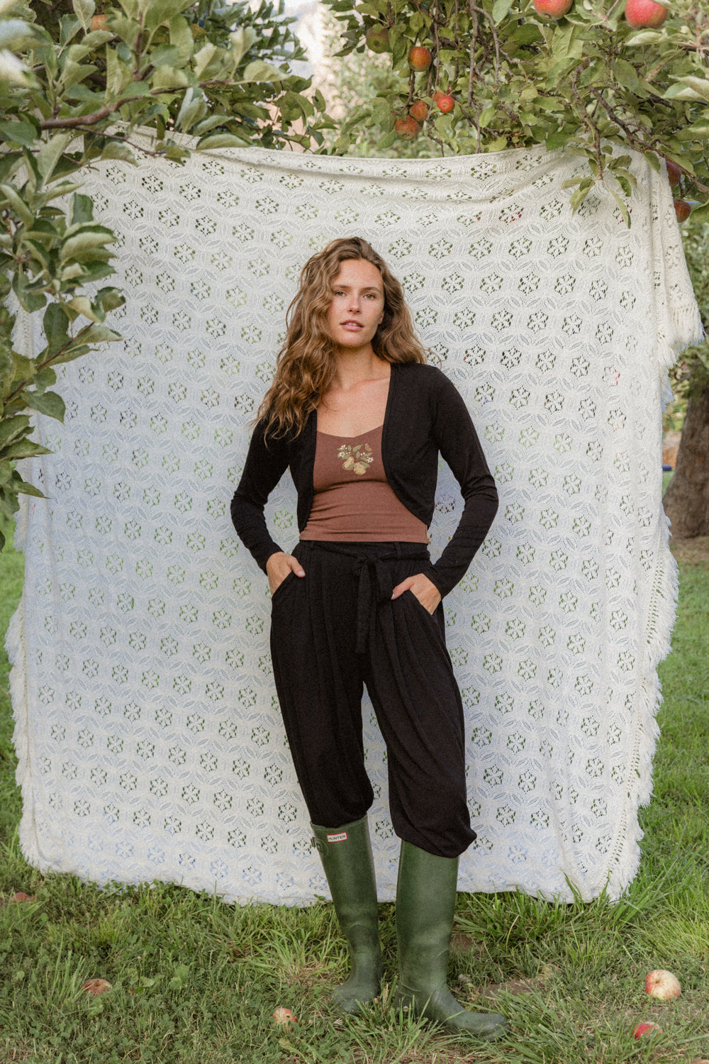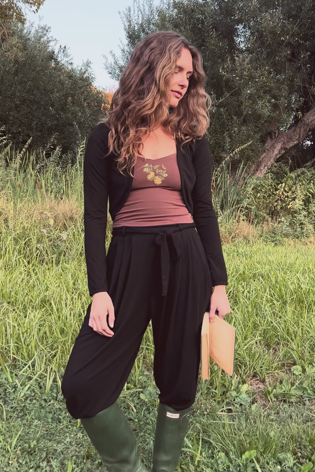 We use plant-based fabrics like TENCEL™ lyocell, ECOVERO™ viscose, and organic cotton, blended with Creora® bio-based spandex for gentle stretch. While the spandex still contains some petroleum, it’s partially derived from renewable sources—making it a better option than traditional synthetics. The result: soft, breathable, lower-impact clothing that feels as good as it is.