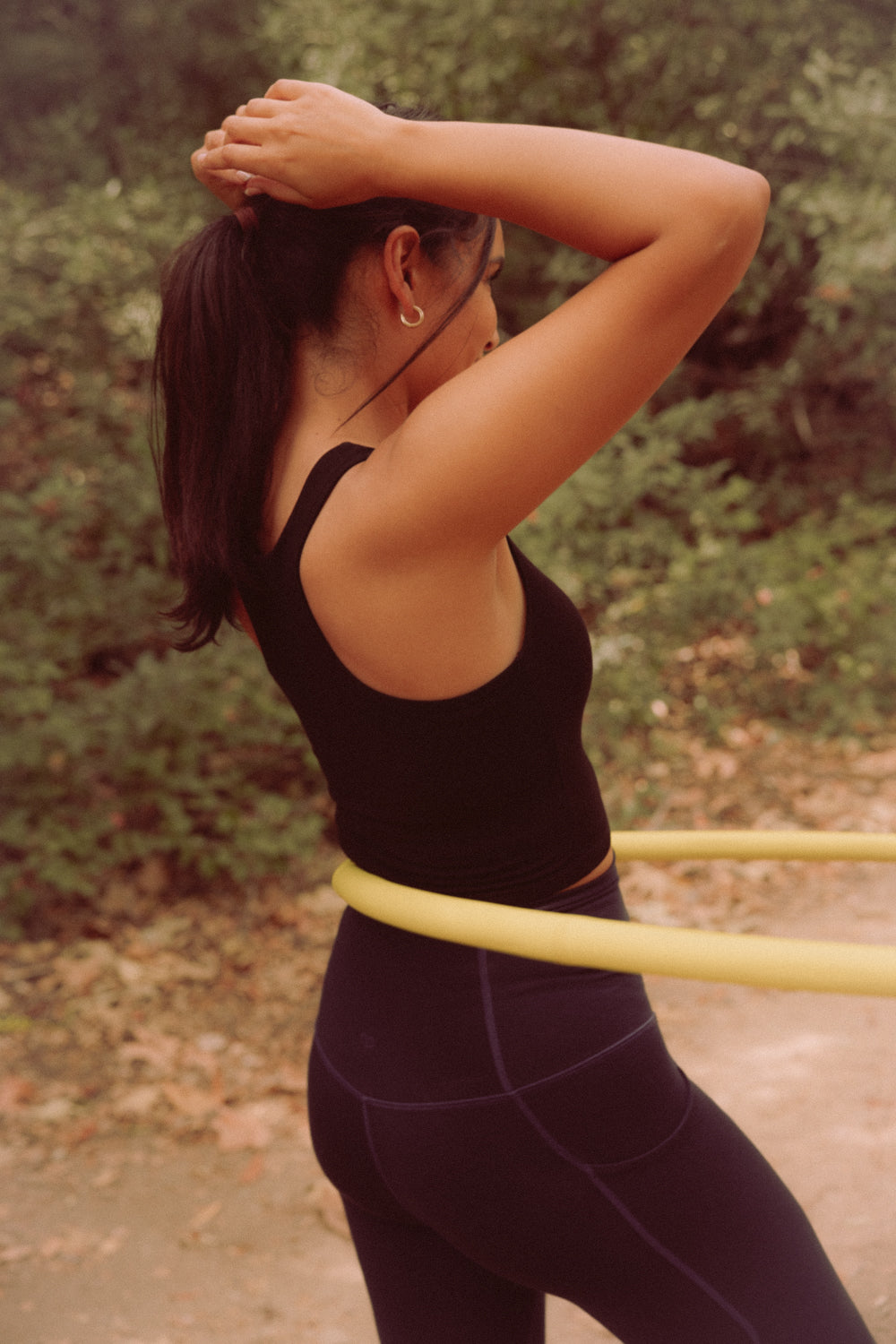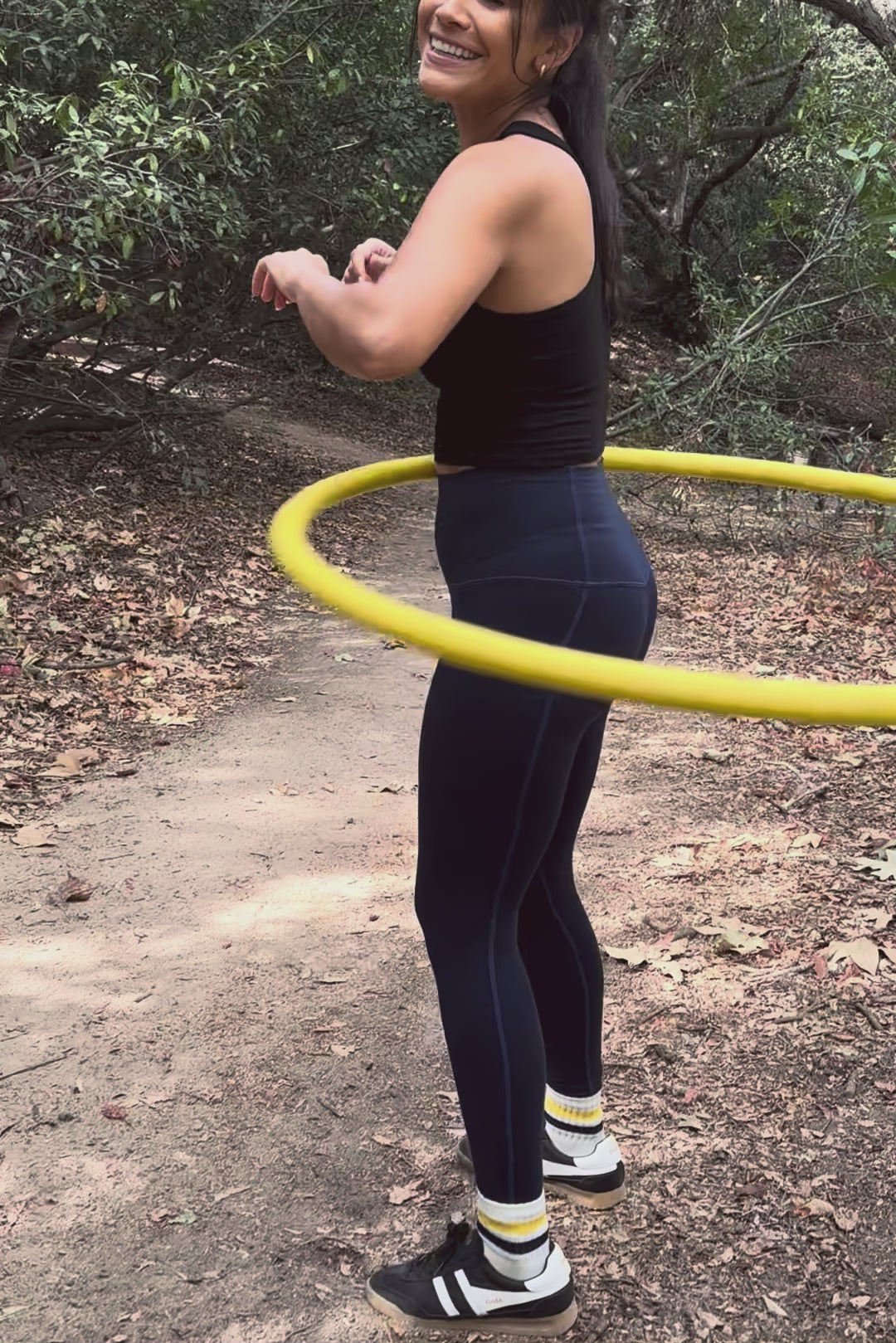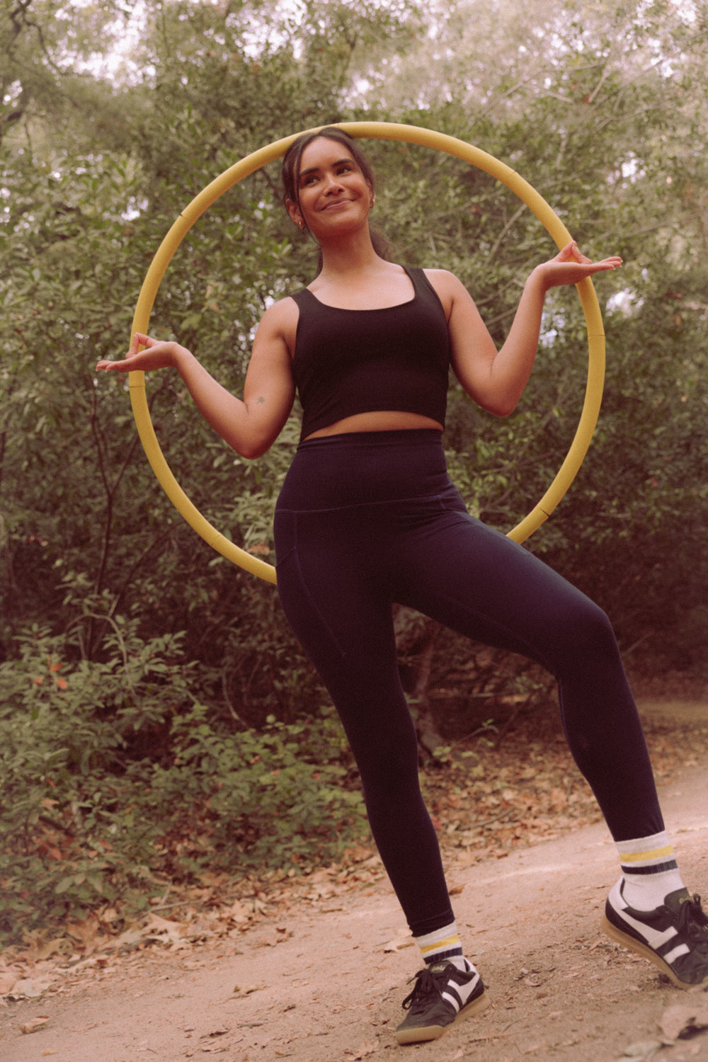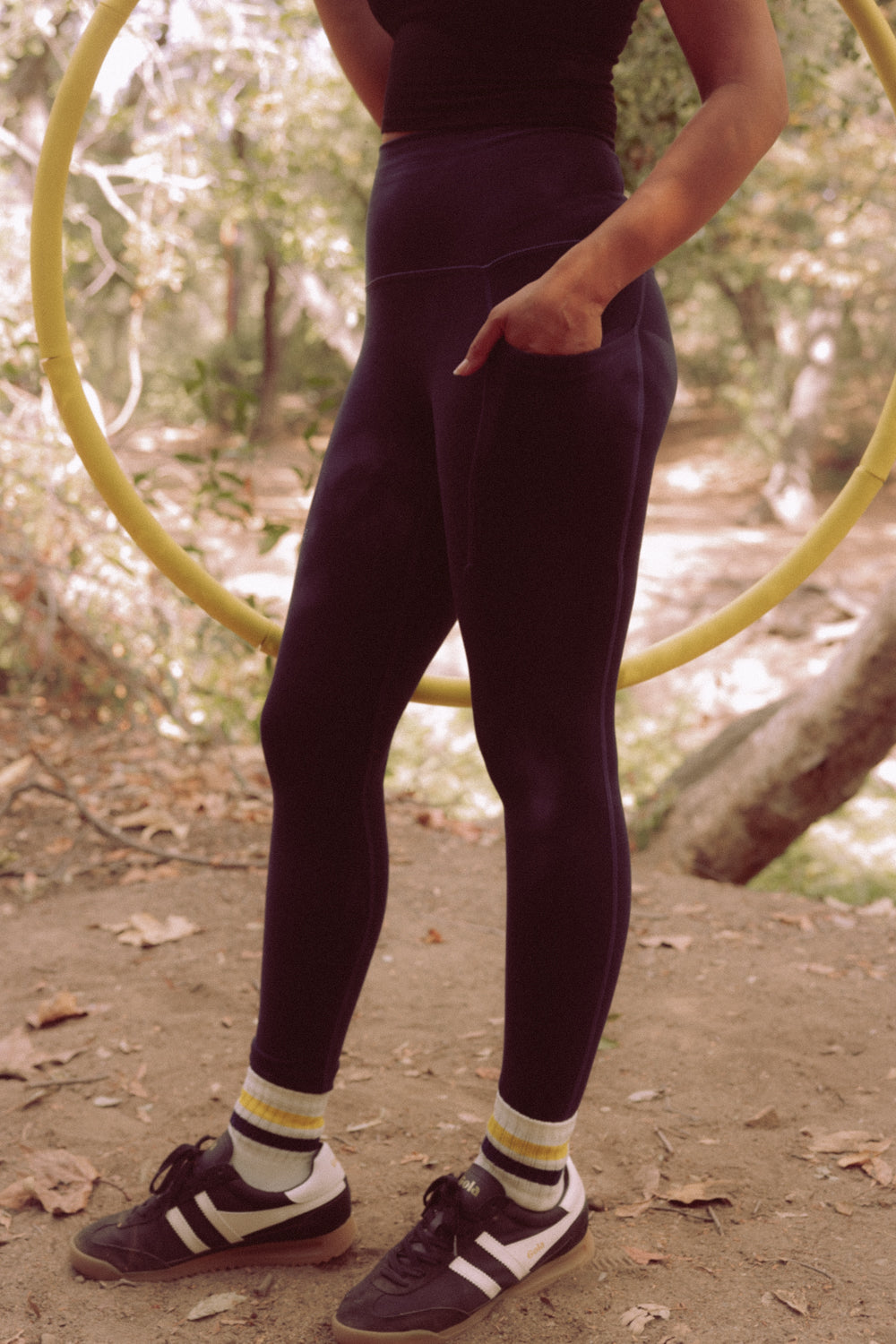 I like these even better than the previous pocket leggings. They are super soft and compressive, but in a comfy way (as Purush People tends to be!). I went on a 2 mile run in these with my phone in the pocket and did stop once to adjust them up, but then they stayed in place the rest of the time. When I did squats and other workout movements they stayed in place too. I love them and might buy a second pair… Only criticism is that the logo reminds me of all the other basic athletic brands out there, I would love it to be more cutesy as is the usual Purusha aesthetic, but since it’s small and unnoticeable it wasn’t a big deal to me. But a cute moon would be way better imo! I got a size large, waist 34”, hip 45”, 5’10” and 180 lbs.