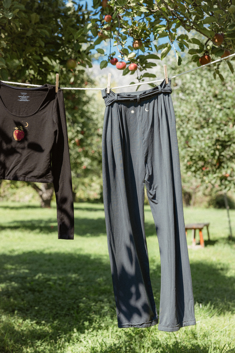 We use plant-based fabrics like TENCEL™ lyocell, ECOVERO™ viscose, and organic cotton, blended with Creora® bio-based spandex for gentle stretch. While the spandex still contains some petroleum, it’s partially derived from renewable sources—making it a better option than traditional synthetics. The result: soft, breathable, lower-impact clothing that feels as good as it is.